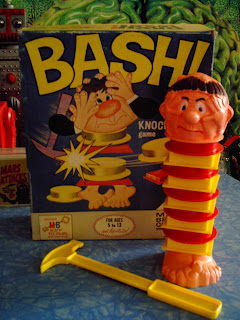 Mere words cannot describe how incredibly satisfying this toy is. Dating from 1965, BASH! was one of the hardest-to-find games on my wish list. Now that I have it, I can't get enough of it. Game play is simple: stack up the yellow and red plastic slices that comprise the BASH man's body. Then, using the special hammer, take a WHACK at the slices, trying to smack one the heck out of there! If you do it right, it's like that old gag where someone yanks a tablecloth off a crowded table without any of the dishes falling: BASH's head will simply plop down onto the remaining slices. But if you do it wrong, the whole thing crashes apart in a magnificent cascade of clattering plastic. It took me a few days to get the technique down, but now I can BASH happily away, thinking all the while of things that are stressing me out. A few WHACKS and the stress is gone! Loads cheaper than therapy, I highly recommend a few sessions of BASH for all your troubles.