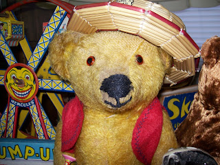 While I am always happy to add a high-quality, pedigreed antique Ideal or Steiff teddy bear to my collection, I have to admit that the bears that really make me smile tend to be mongrels: made by unknown makers of questionable skill, resulting in goofy and unusual creations. Here are two of my favorites. The guy with the hat, grin, and Jimmy Durante nose is a British ted from the 1930s. The somewhat startled-looking bear in the bow tie with the crooked ears is a 1920s German teddy.