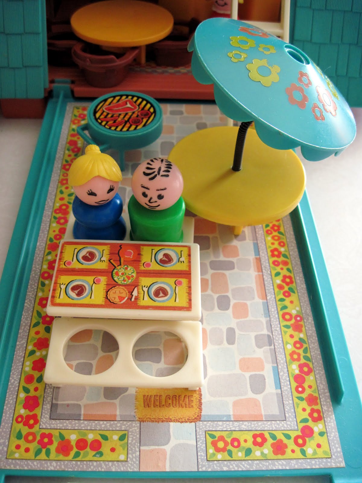 The Fisher Price people in the previous post (1960s Nifty Station Wagon) might be traveling to this lovely vacation resort, the Play Family A Frame house, made in 1974. These kitschy structures were all the rage as holiday homes across the United States in the 1960s and '70s, and Fisher Price's 11 inch tall version is absolutely adorable. From the aqua green roof tiles to the faux-Bavarian balcony, built-in kitchen, cozy fireplace, and comfortable patio, they got all the details just right.
