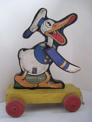 Coming up this month will be vintage Fisher Price Easter Carts & Toys. Starting in 1936, Fisher Price began selling an Easter toy line to keep production and momentum going all year round. Many of Fisher Price's earliest Donald Duck toys were actually Easter releases, as the duck was a seasonally appropriate theme. Fisher Price also created what it referred to as "Easter carts," a wide variety of pull toys with an open truck bed, train car, or cart area that could be filled with Easter grass and candies and used as a child's Easter basket. These toys were all made of lithographed paper over wood, and many incorporated movement and sound effects into their design. Stay 'tooned...