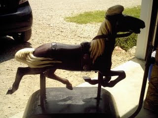 Earlier in the summer, I bought an old coin operated kiddie ride horse at an antique fair. It had been sloppily re-painted in very drab colors, including a heavy coat of black paint over the entire base, and mom was just itching to tackle it. I could see her looking appraisingly at it the first time she saw it, and after that, every time she