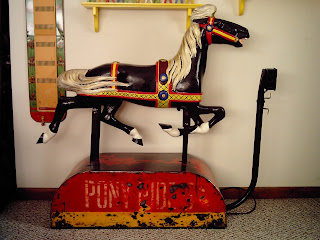 Within a day, she had painstakingly stripped all the nasty black repaint off the base to reveal the original colors and even the lettering. The base was originally red with yellow trim and the words "PONY RIDE 5 c" stencilled on the side. It was so exciting to discover this had survived! We debated whether to completely restore the base by repainting and restencilling, but decided to leave it as is, showing all its use and wear. This horse was ridden by a LOT of kiddies back in the day (1940s), as the paint is worn almost completely away on the base top, where they would have been climbing on and off. To me, this wear is an important part of its history, and I enjoy seeing it. How someone could have just slapped all that nasty black paint over it is beyond me...