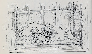 "On the sill of one of the windows facing the road stood the pine cone trolls, with their wooden faces and their big wooden hands and feet and their long gray lichen-colored hair. Their kingdom lay between the inner and outer windows and each year it changed. Sometimes they peered from caves among piled-up stones; sometimes they were in a mossy forest of little pine trees. This year Sigrid had stood them on a mountain of cotton-batting snow. Selma ran to fetch their box from the back of the cupboard. First she carefully put away the cotton. Then she paused with the man troll in one hand and the woman in the other, their mouse tails hanging down. She didn't put them in their box at once. The woman troll was smaller than the man and had a cotton handkerchief tied over her coarse gray hair. But otherwise, they looked alike. Their eyes were little and their noses were long and their mouths were crooked. Selma stared at the little trolls and the trolls stared back at Selma. When Sigrid went by, Selma said in a whisper, 'Are they real, Sigrid? Are there real trolls?' 'There they are, right in your hands,' said Sigrid, laughing. 'They are as real as bread and butter.' But that wasn't what Selma meant. Whenever she asked about trolls, Sigrid wouldn't take her seriously. At last, sighing and wondering, she put the pine-cone trolls safely in their box until, in November, the cold and darkness of autumn should bring them back to their narrow kingdom between the windows."