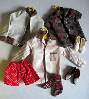 He's got swimwear (including a snorkel, mask, and fins), tennis togs and shoes, a letterman sweater, jeans, khakis, bermuda shorts, a bowling shirt, polka dotted boxers, pinstriped pajamas, and loads more. Some of my favorite pieces are shown below: