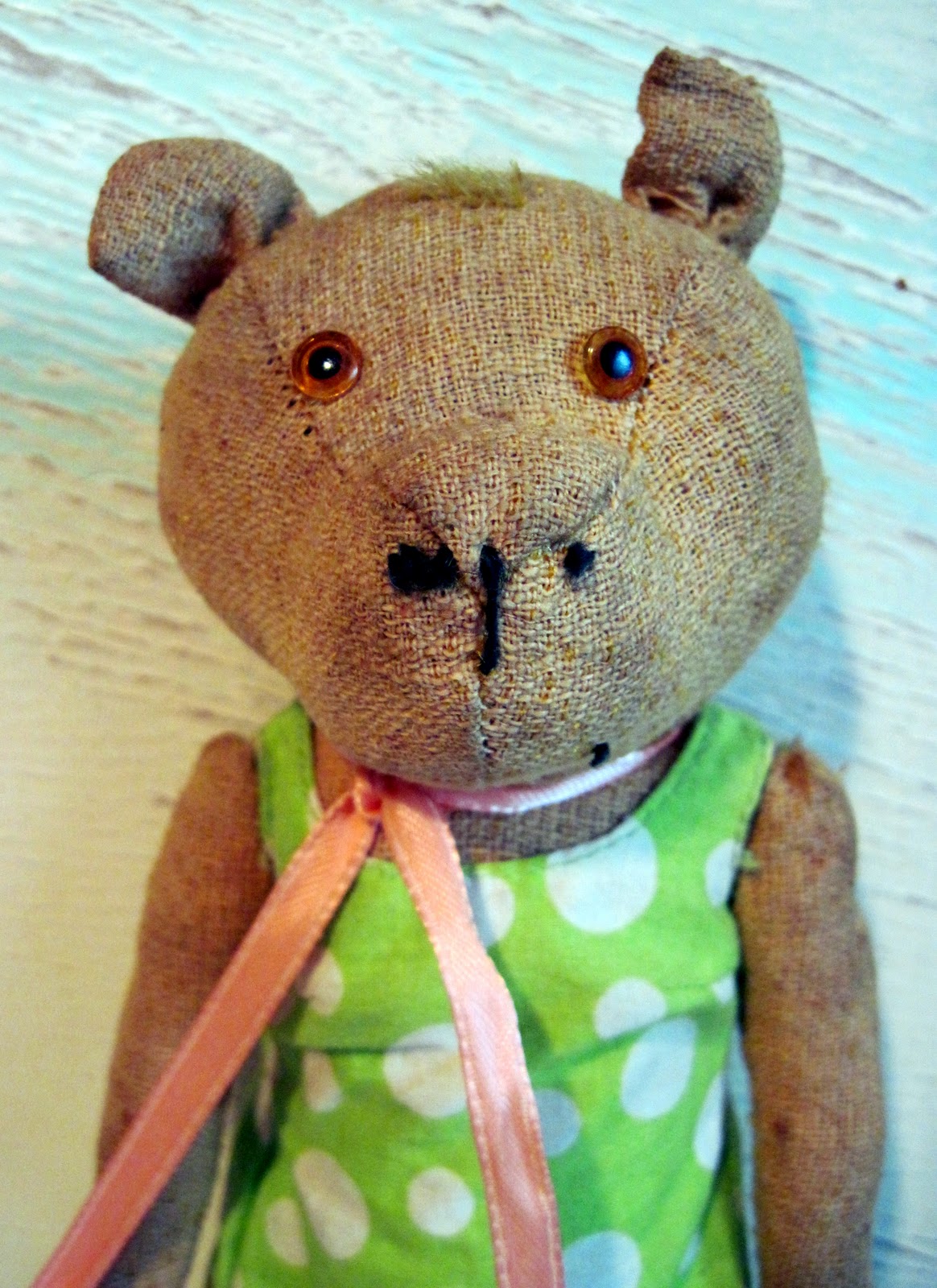 After rummaging through a box of doll clothes assembled for just such emergencies, I outfitted the bear in a vintage polka dotted dress and added a pink ribbon.