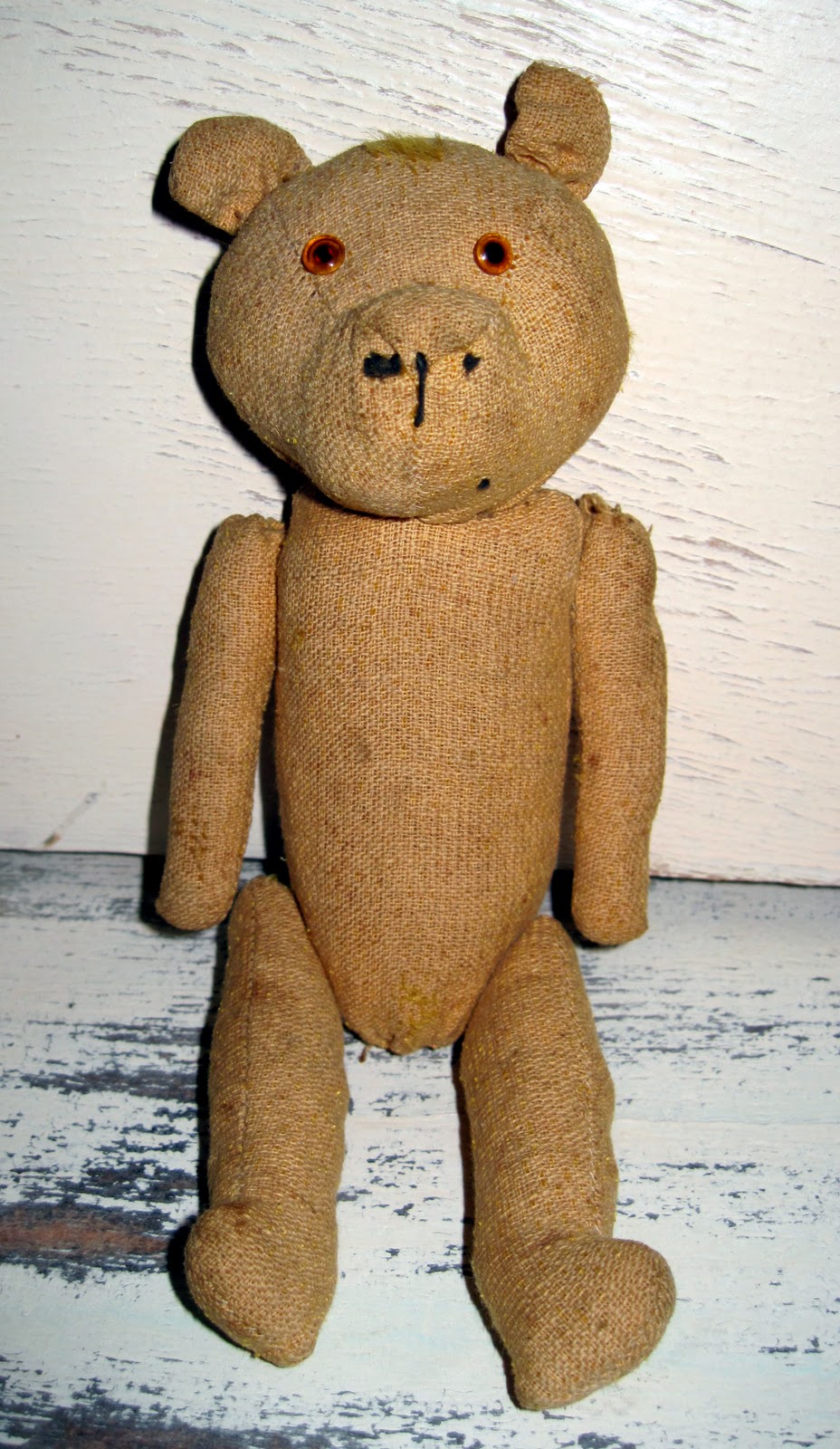 My latest such bear is this little 8 inch ted, circa the 1930s. She has lost every single strand of her mohair to moths, except for a very endearing little patch at the top of her head. Her nose and mouth have long since been kissed away, but her tiny glass eyes are, amazingly, still intact. She is without doubt one of the most worn bears I've ever purchased, but I think she is also one of the most characterful.