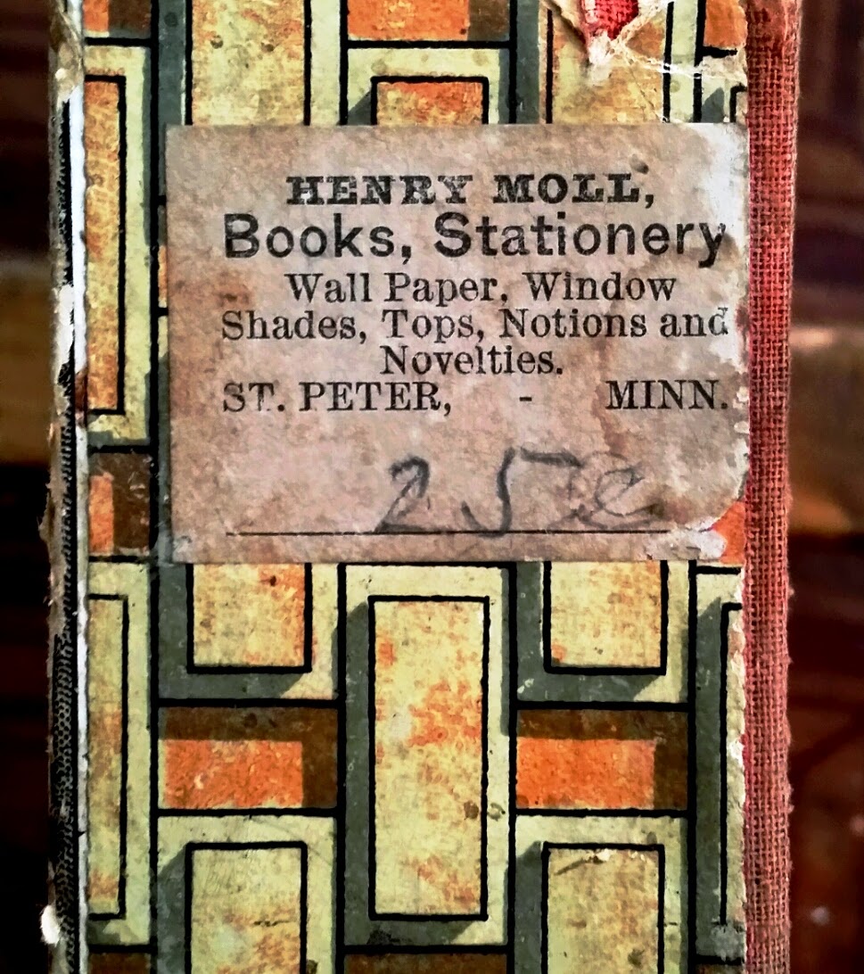 The outside of the box still retains its original store label and price (25 cents, no small amount back in the late 1800s!) It was sold by Henry Moll in St. Peter, Minnesota, whose shop, interestingly, specialized not in toys, but in books, stationery, wall paper, and window dressings. You can imagine a Victorian mother carefully examining wall paper samples at Mr. Moll's shop while her daughter was kept occupied with this little dollhouse.