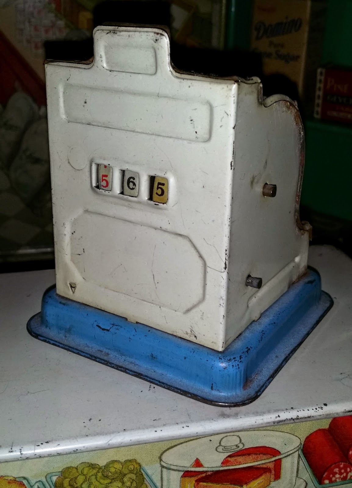 The miniature tin cash register actually works: as the levers are moved, numbers ring up on the other side, and the drawer springs open to take in tiny coins.