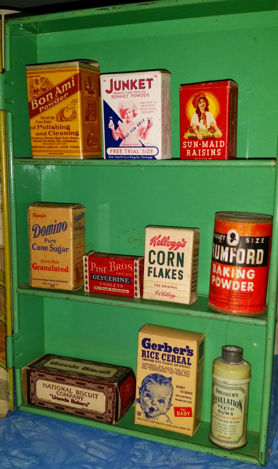 The store's actual shelves came filled with miniature packages, and the original child owner added a few additional pieces, including some salesman samples she probably got while shopping for real groceries with her mother.