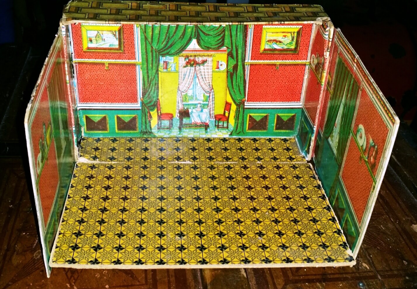 My favorite Christmas present this year was a German folding dollhouse room box, circa the late 1880s - 1890s. It was clearly a favorite of its original owner as well, as she carefully treasured the fragile toy over many years.