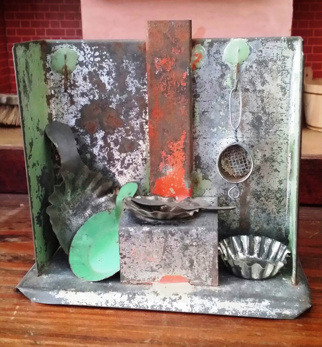 I received these two tin kitchens for Christmas this past year. The first was made in Germany in the 1870s, and although small, measuring a mere 6 inches wide by 4 inches tall, features some fine details. There is a functioning tank on the right side which delivers water through a spout on the inner wall. The stove has a hood, a door that opens, and a rarely seen heat regulator (the tiny tab above the door: it slides to reveal an opening which would allow heat to escape from the oven.)