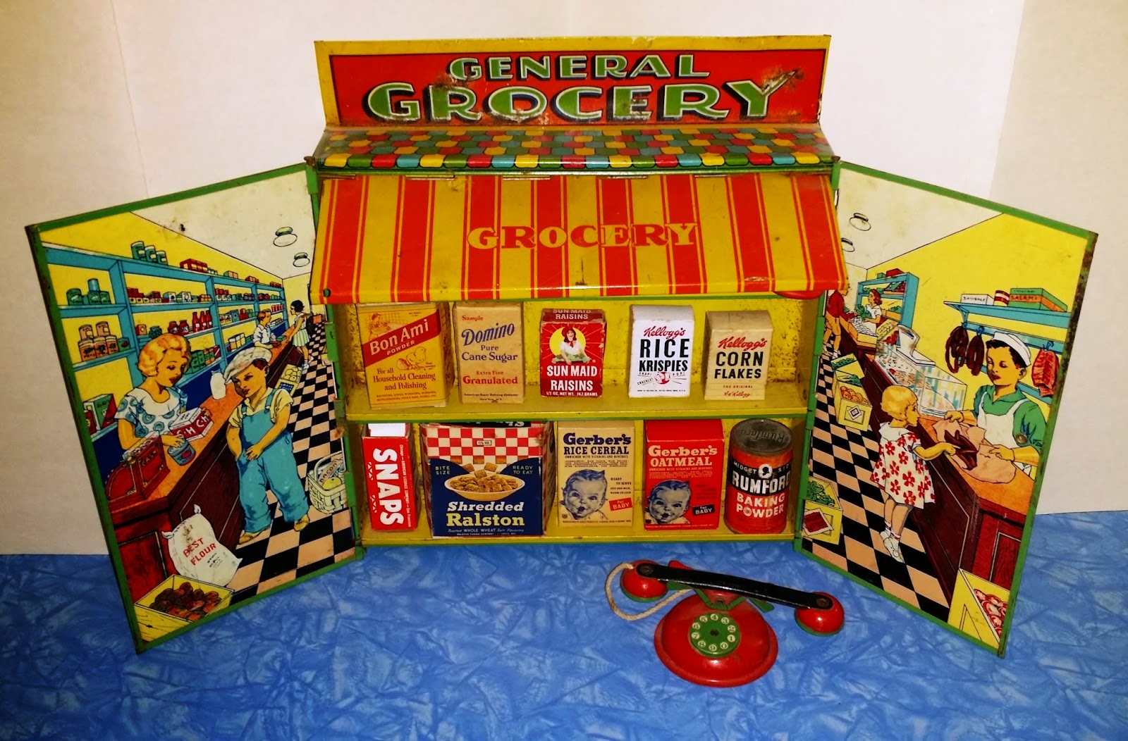 The Corner Grocer was one of this year's best Christmas gifts. A few years ago, I received another Wolverine tin shop, the General Grocery, which also dates from the 1930s - 40s. This one is smaller, measuring 20 inches wide by 12 inches tall. It is structured differently from the Corner Grocer, with its shelves in the center panel. The side wings still fold in for storage, but they feature beautifully lithographed images of children shopping. Although this set is missing its counter, it still has its original shop phone, along with a feature unique to this particular grocery, a fold out awning.