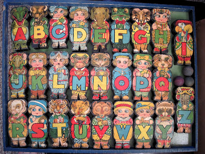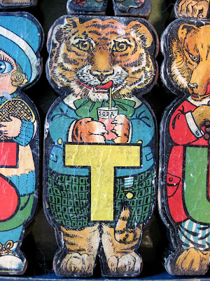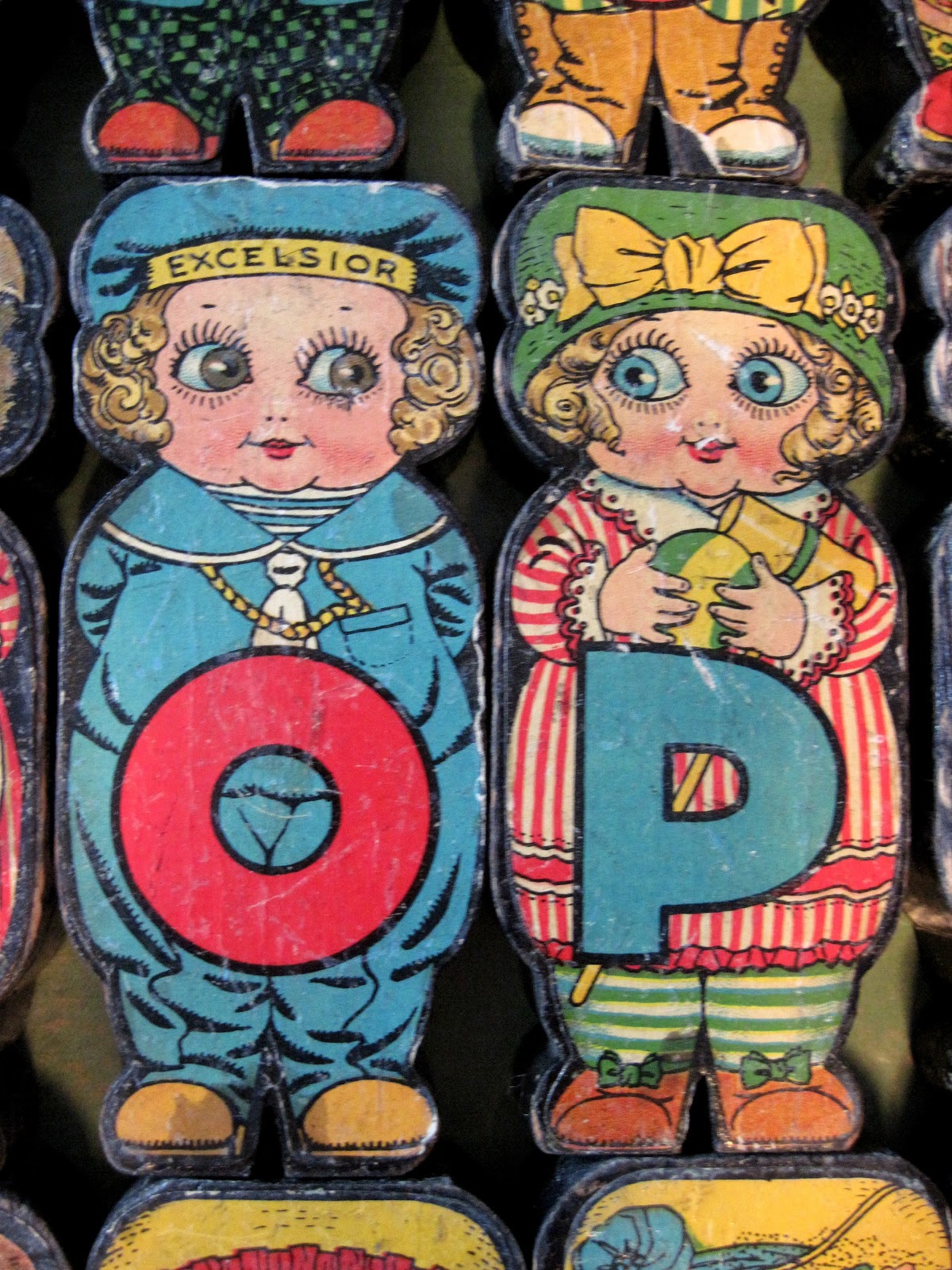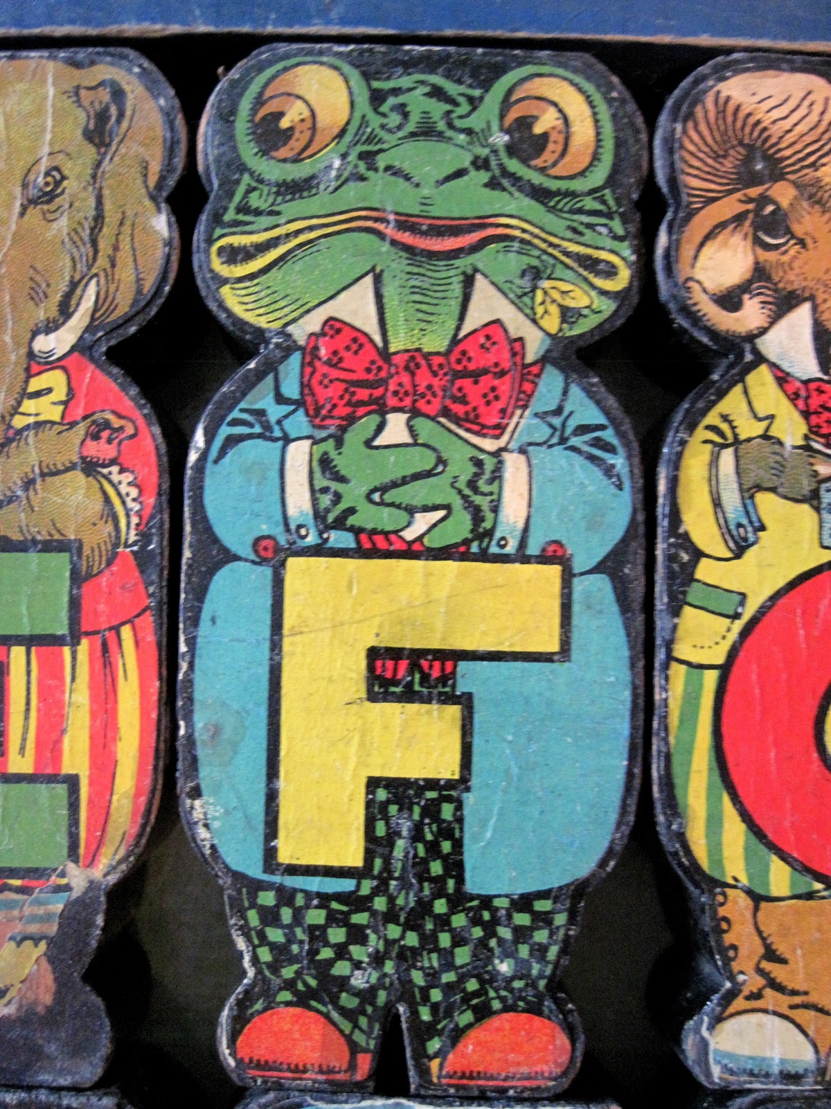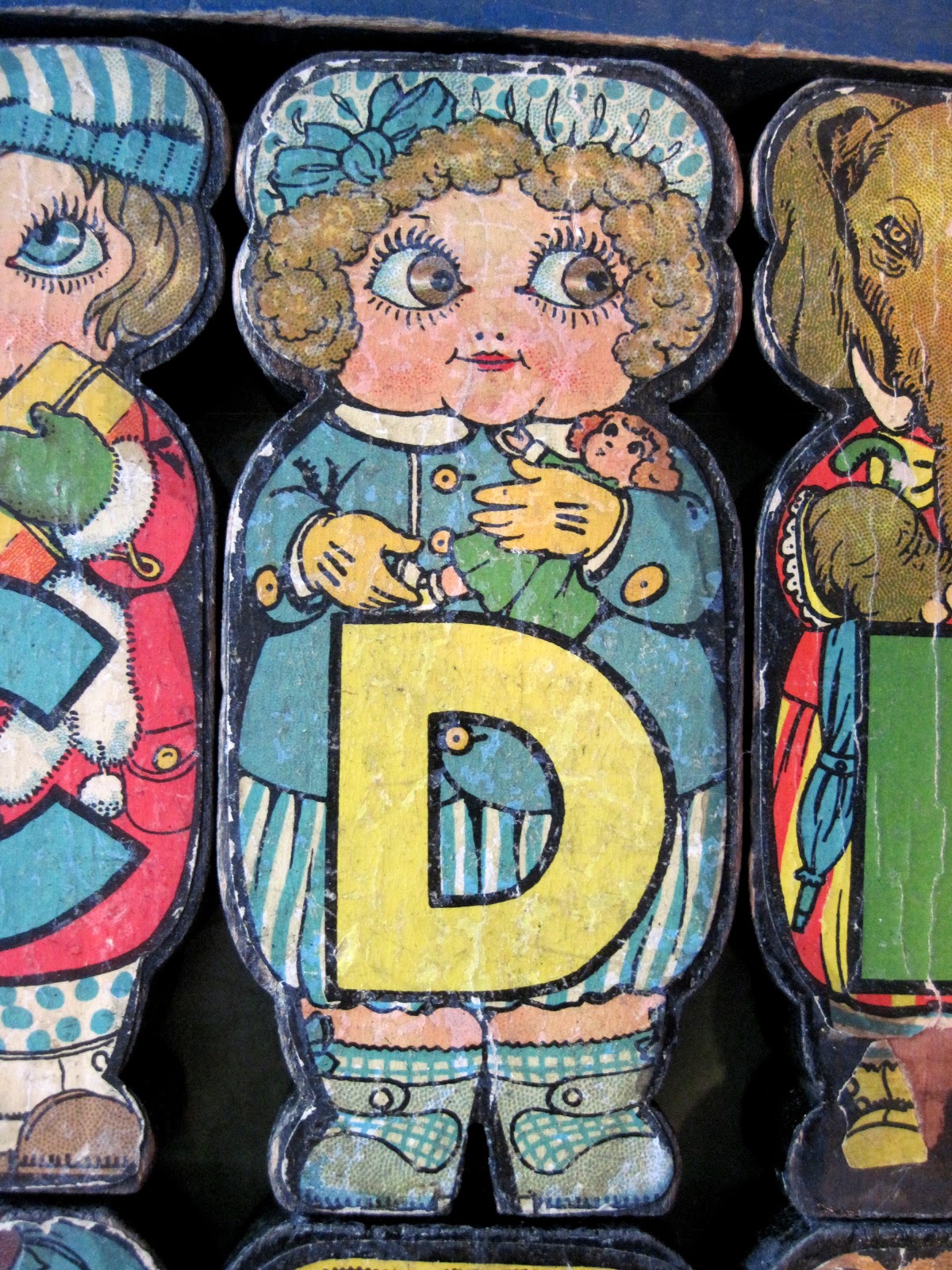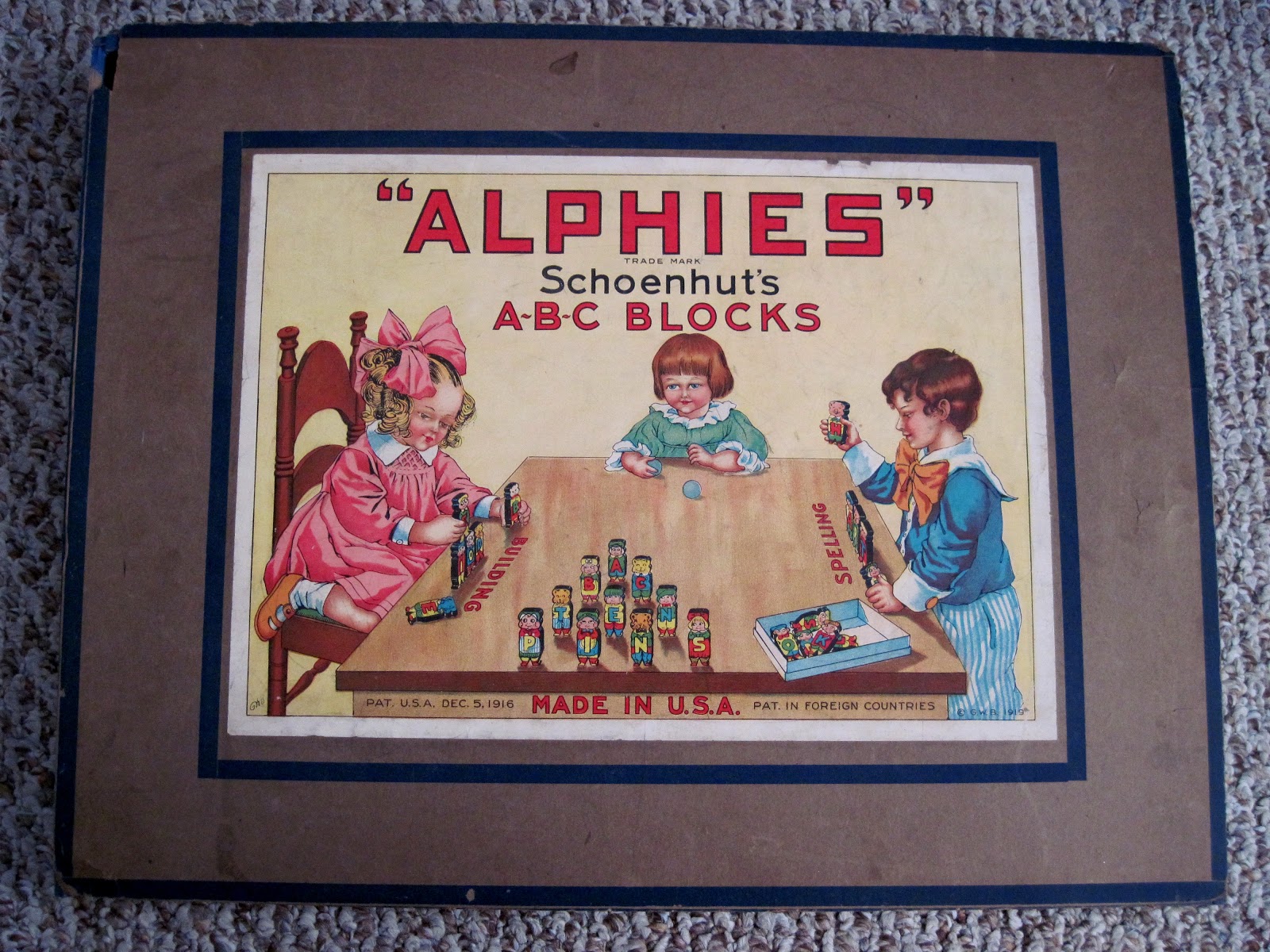 The Alphies, first patented in 1916, are five inch tall wooden blocks with lithographed paper characters on both sides. One side depicts "Alphie Dollies," the other an "Alphie Zoo." Each character bears a letter of the alphabet on its front.