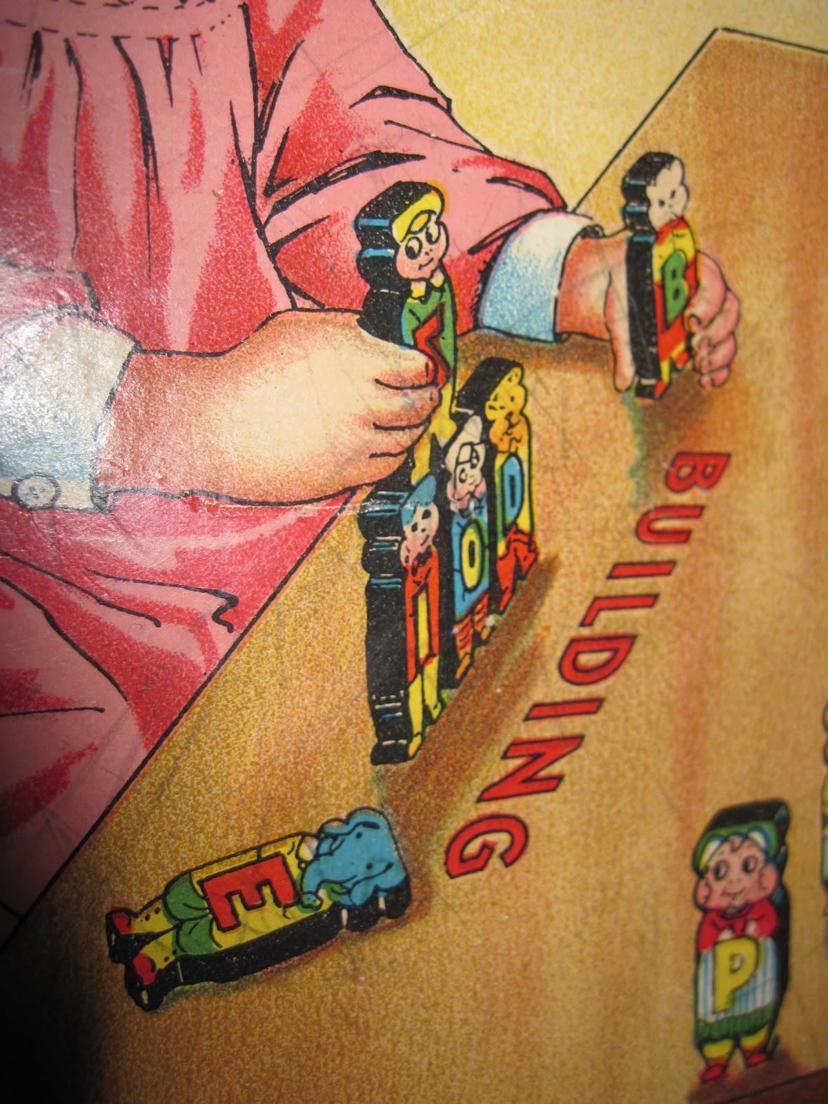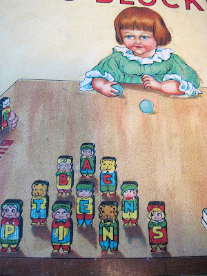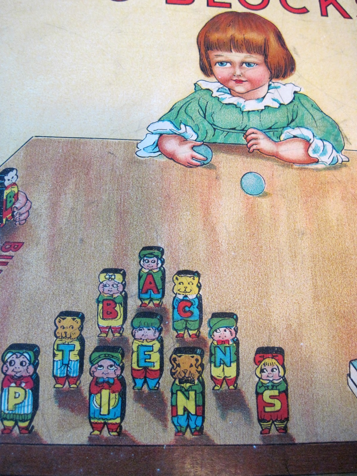 The Alphies were intended as multi-purpose playthings, as depicted in the possibilities shown on the box cover. They could be used to practice the alphabet and spelling; for stacking and building; and could even be set up as a bowling game, using the included wooden balls.