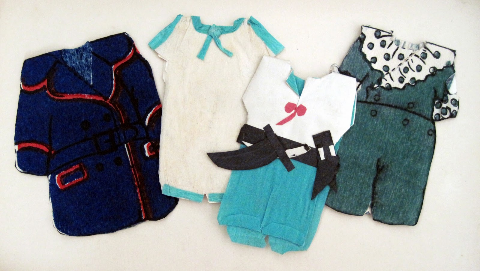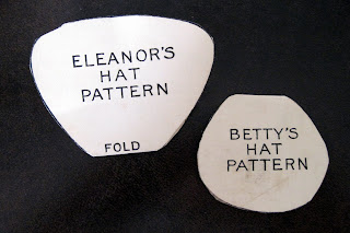 Some of the crepe paper clothes came printed with clothing designs, but other items looked as if they were cut and assembled by the child owner. The discovery of some hat pattern pieces in the bottom of the box confirmed this suspicion, and the patterns also gave the names of the dolls: Eleanor (the big sister), Betty, and Bobbie, the little brother.