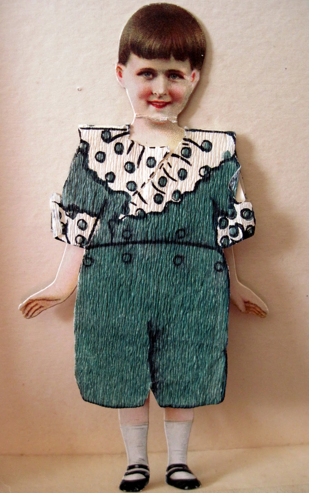I'm always amazed when I find a fragile paper toy that has survived through long years of play, and this just may be the most amazing such toy I have. Made from the late 1800s through the early 1900s as an advertising premium by the J P Coats Company (now the Coats & Clark Company), this 6 inch paper doll is really 12 toys in one.There's a different doll printed on each side of the figure, with 3 different heads for each doll concealed on a rotating wheel within its body. Beautifully lithographed, it's a charming toy as well as a very clever one.