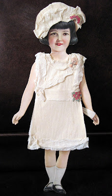 The dolls were made by Dennison, a manufacturer primarily of paper party goods, decorations, and supplies. The jointed dolls are made from heavy card stock, and most of the clothes are of crepe paper, which Dennison used for many of its holiday decorations.