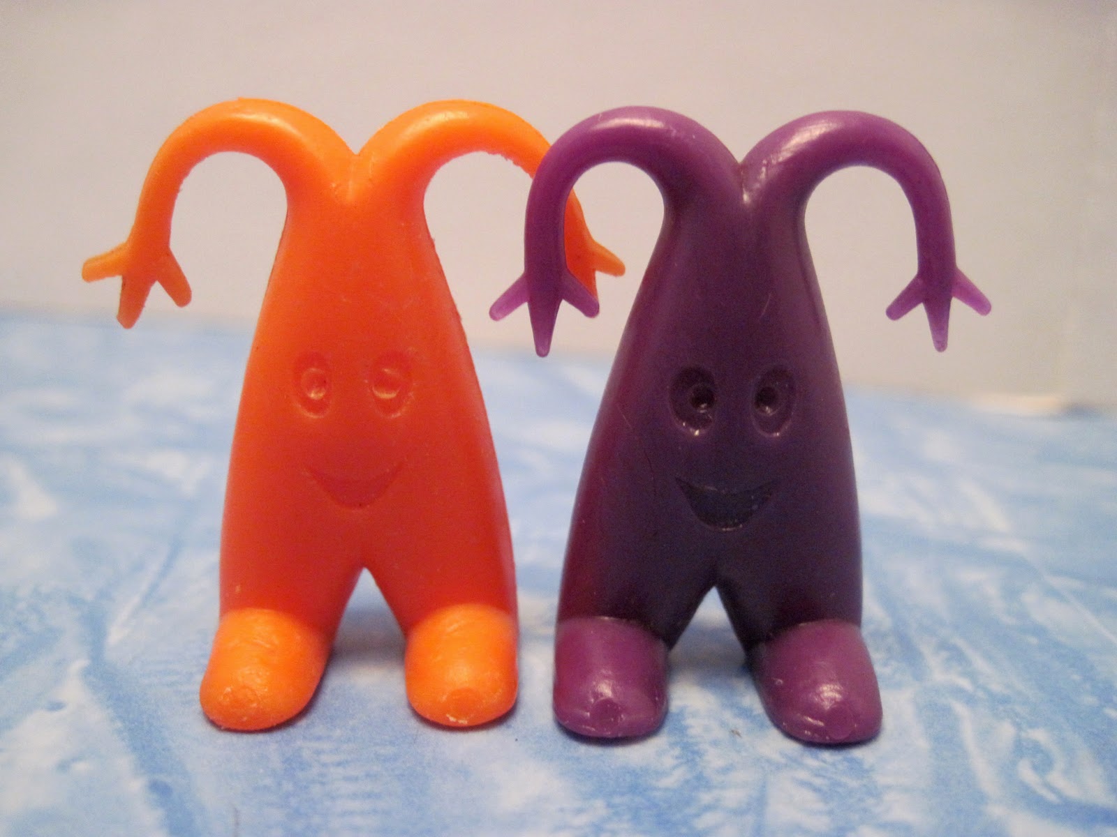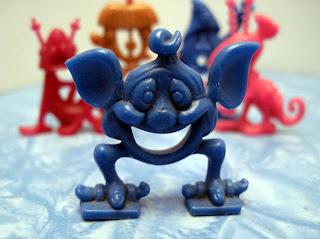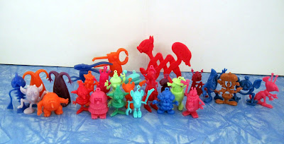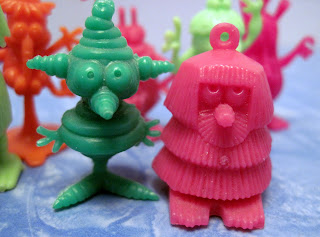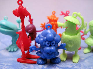 At a weekend toy show recently, I found a whole heap of...well, very odd things. These little plastic characters, between 1 and 1 1/2 inches tall, were cereal premiums (and sometimes Cracker Jack prizes) made in the late 1960s and 1970s by an Australian company called R & L. The tiny toys were found in packages of Kellogg's cereal worldwide, although there were some country exclusives. In the late '70s, the company was sold and the owners moved the plant to Mexico, where production continued in a range of new, brighter colors.
