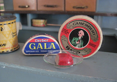 Tiny cheeses: cardboard, composition, and glass. Dish is 1 1/4 inches in diameter, circa 1930s.