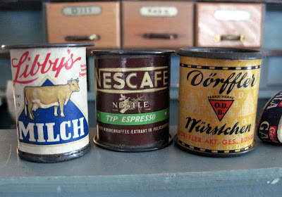 Miniature canned goods (milk, coffee, and sausages): tin cans with paper labels, made in Germany circa the 1930s, 1 1/2 inches tall.